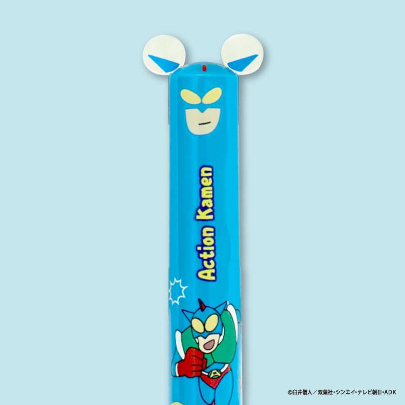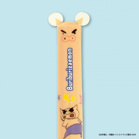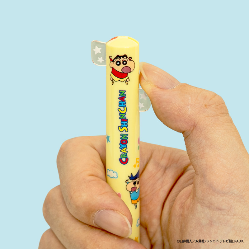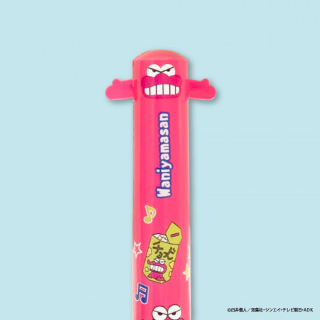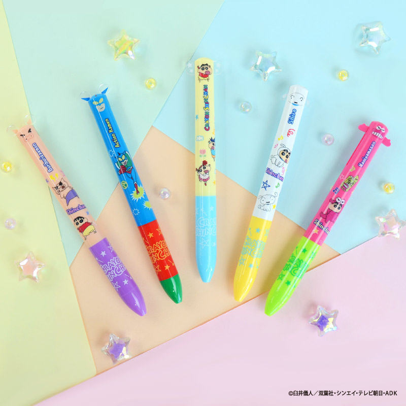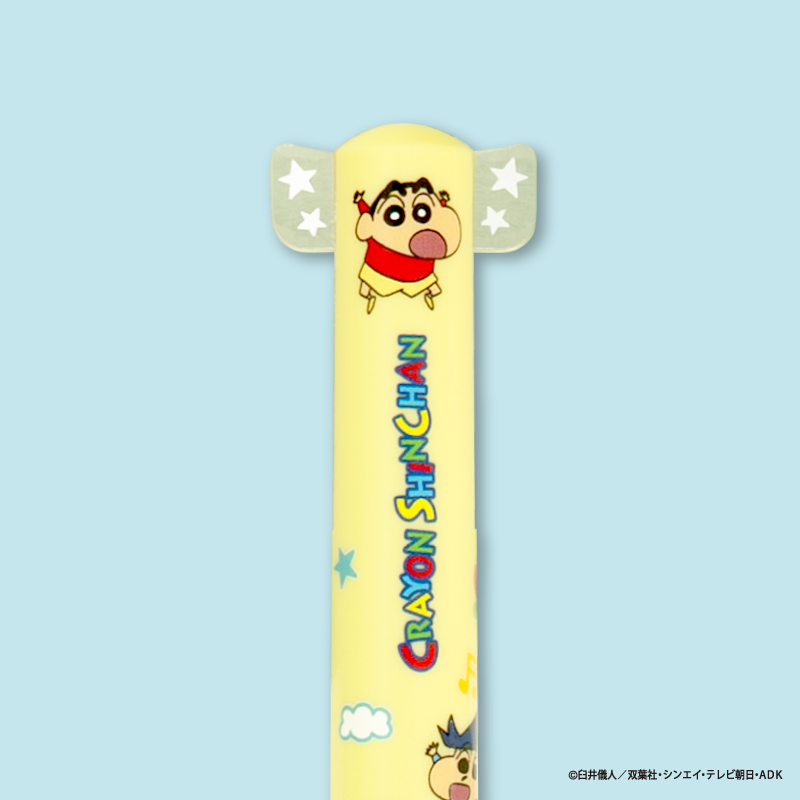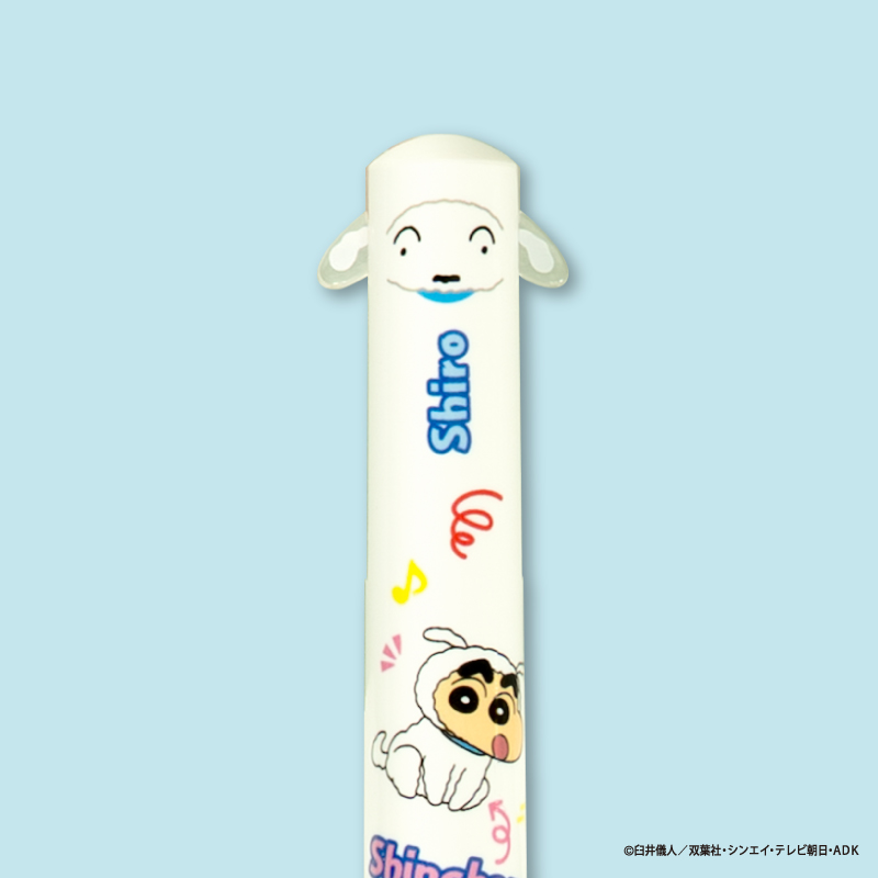 しんちゃんやシロ、ぶりぶりざえもん、アクション仮面、ワニ山さんといった各キャラクターの耳や手などの部分がノックできるようになっている便利な2色ボールペンです。